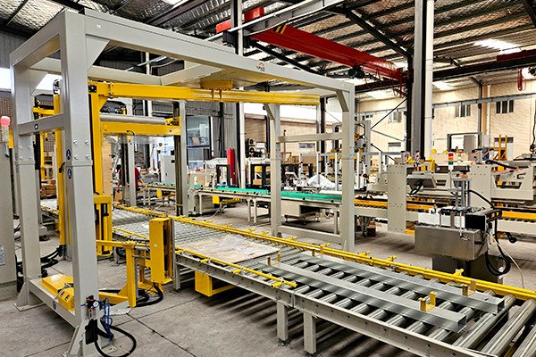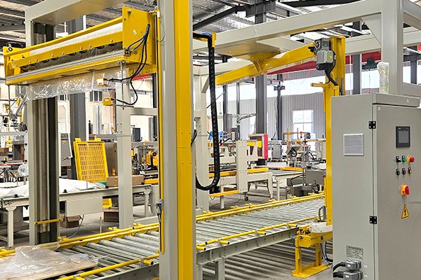 電動工具托盤碼垛通過式覆頂膜纏繞捆扎包裝線,是由自適應型供棧機、機器人碼垛機、棧板穿劍捆扎機、通過式覆頂膜機以及搖臂式纏繞包裝機組合而成。自適應型供棧機可根據(jù)不同托盤尺寸,自動調整機器并分配托盤,節(jié)省了人工換產(chǎn)的時間。